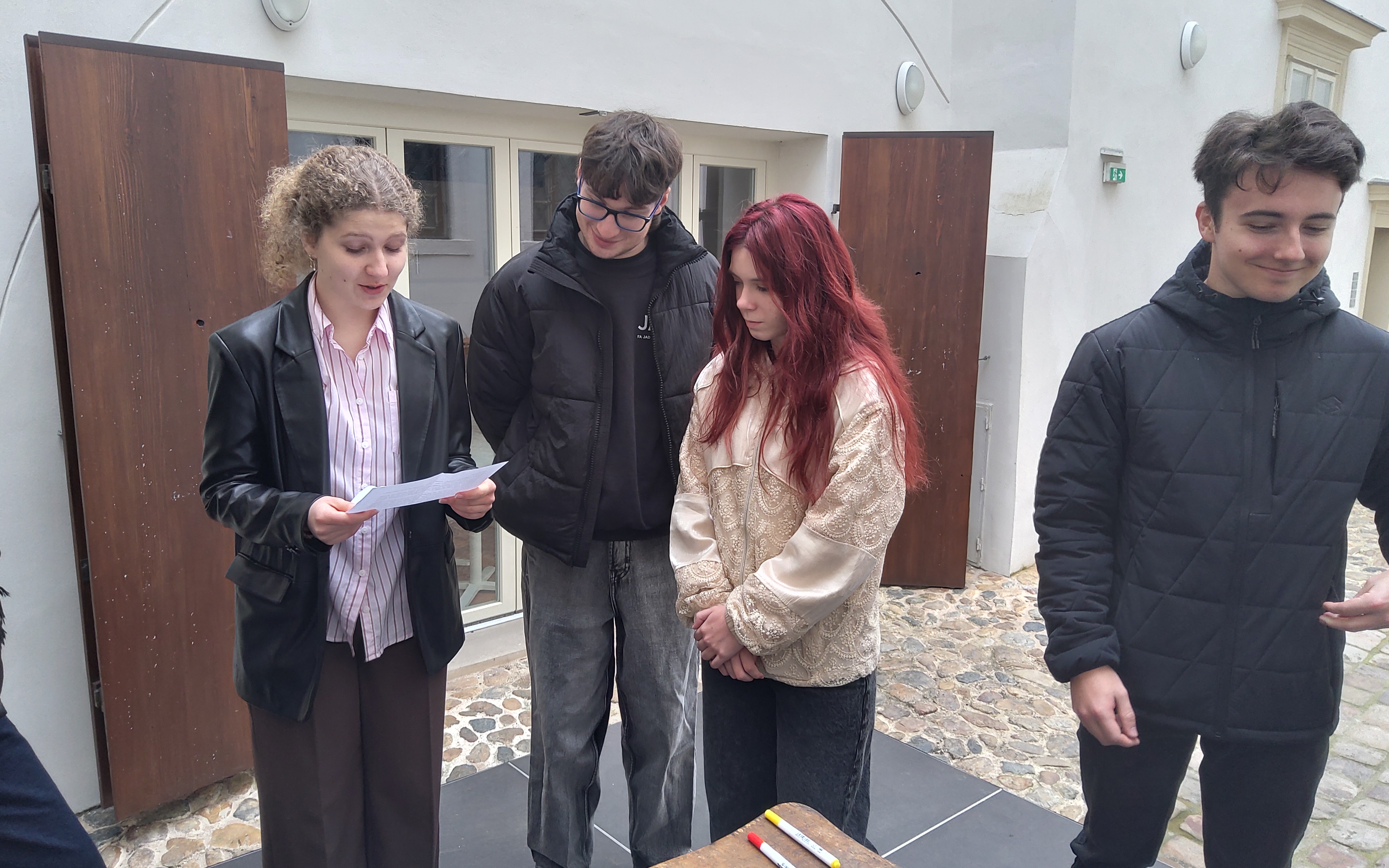 Leden roku 1942 znamenal pro Blovice ztrátu. V tomto měsíci totiž byli z Blovic deportováni blovičtí Židé. Byli deportováni, aby se už nikdy nevrátili. A nezbylo po nich téměř nic. Zmizeli v dějinném procesu, který se nazývá šoa - katastrofa. Zavzpomínat na oběti šoa v Blovicích bylo možno také díky Festivalu židovské kultury 10.- 14.4. Na přípravách a průběhu některých akcí se podíleli i žáci našeho gymnázia. Pomáhali s dohledem na výstavě Motýla jsem tu neviděl, další výstavu výtvarných prací připravili, zpracovali prezentaci o židovských obyvatelích Blovic a také se účastnili pietního aktu pokládání kamenů zmizelých. Jsem velmi ráda, že naši školu navštěvují tak šikovní a činorodí mladí lidé.
